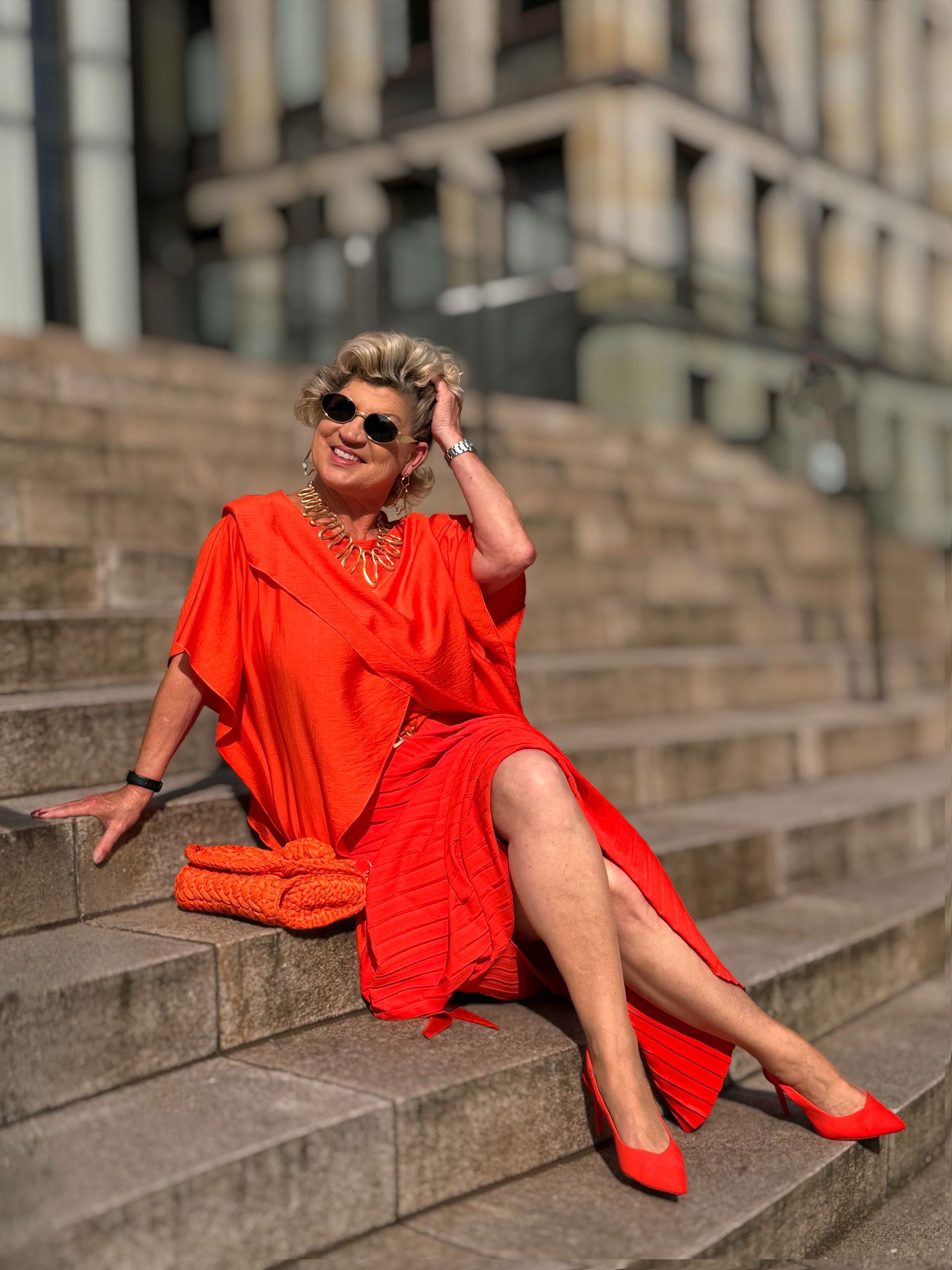 Der Herbst ist da – und mit ihm eine Farbe, die einfach immer und sofort gute Laune macht: Orange! Egal ob Kürbis, leuchtendes Herbstlaub oder Sonnenuntergang – dieser Ton bringt Wärme, Energie und ein bisschen Glanz in graue Tage. Und das Beste: Orange steht wirklich jedem, wenn man den richtigen Farbton für sich selbst findet. Warum Orange so besonders ist? Orange ist eine Mischung aus Rot und Gelb – also Power pur. Rot gibt Energie, Gelb sorgt für gute Laune, zusammen entsteht eine Farbe, die einfach strahlt. Gerade jetzt, wenn die Tage kürzer und dunkler werden, wirkt Orange wie ein kleiner Stimmungsbooster im Outfit! Das Beste: die Farbe Orange findet sich in allen Textilien, ganz gleich ob Strick, Kunstlederhose oder Cardigan. Man kann sie ganz wunderbar kombinieren. Wer es langsam angehen möchte, kann mit Akzenten starten: orangefarbenes Tuch, eine Tasche oder Statement-Kette können ganz wunderbar zu einem Beginn der Orangeliebe avancieren. Orange lässt sich zudem vielseitig kombinieren. Es passt super zu Naturtönen wie Beige, der angesagten Farbe Braun oder Creme. Aber auch zu Schwarz, Blau und Grün passt es ganz wunderbar und setzt farbige Akzente. Durch Orange wirken Looks harmonisch und herbstlich. Wenn Du mutiger bist, probiere gerne eine Kombination mit einem knalligen Rot oder sogar Pink. Das gibt spannende Kontraste und macht dein Outfit modern! Orange ist einfach die Herbstfarbe schlechthin. Warm, lebendig und vielseitig schenkt sie uns Energie, strahlt Optimismus aus und macht selbst die trübsten Tage ein Stück heller. Eine perfekte Farbe also, um den farbenfrohen Herbst aufzugreifen und um strahlend durch diese schöne Jahreszeit zu walken. Liebt Ihr die Farbe Orange auch so sehr wie ich? Ich bin gespannt! Eure Britta