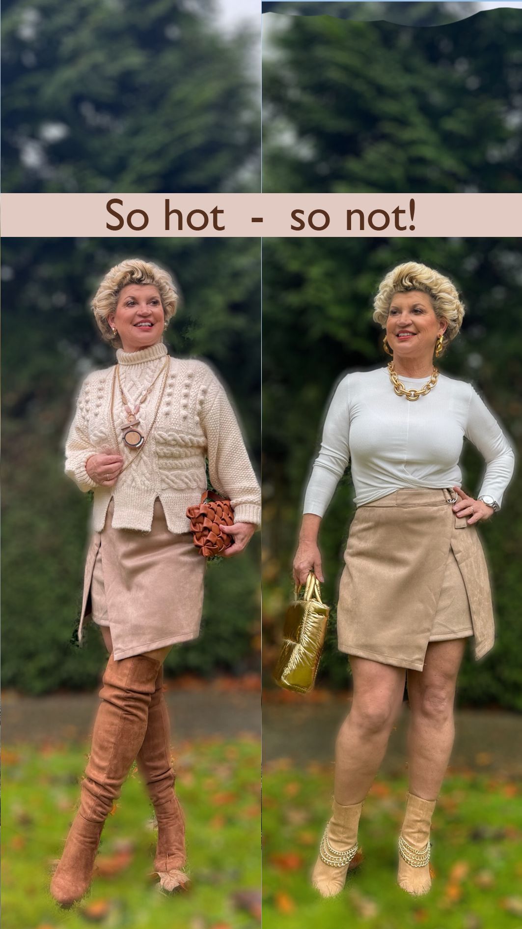 Trägt man einen kurzen Rock, sollte das Oberteile nicht zu eng anliegen oder zu kurz geschnitten sein. High Heels sind okay. Am schönsten aber gepaart mit Stiefeln oder Overknees. Auf dem rechten Foto ist unschwer zu erkennen, dass das gesamte Outfit zwar farblich zusammenpasst und stimmig ist. Für Best Agerinnen ist es aber nicht so sehr geeignet.